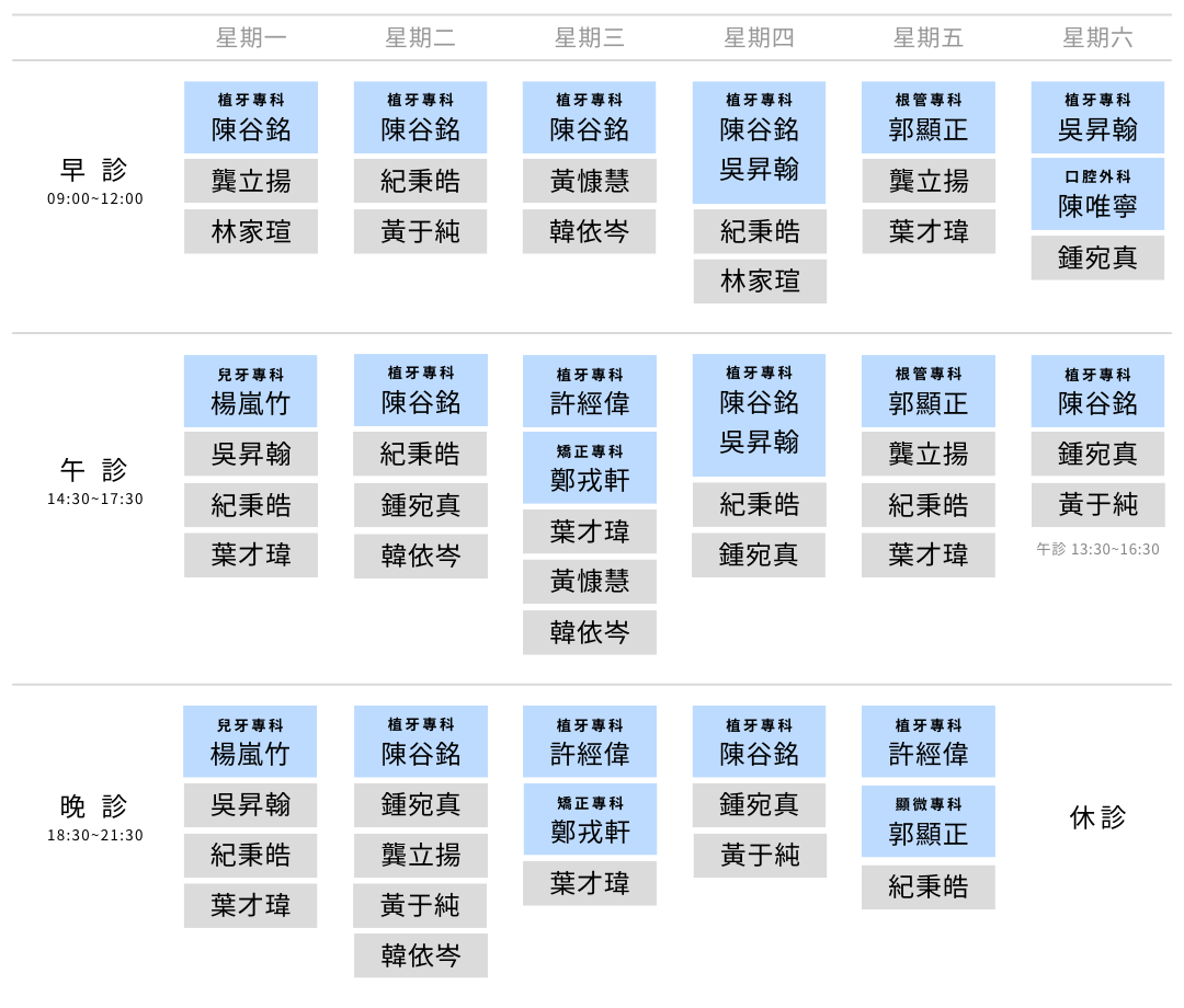- 陳唯寧醫師、鄭戎軒醫師、楊嵐竹醫師與鍾宛真醫師皆有個別門診週期,詳情請來電預約。