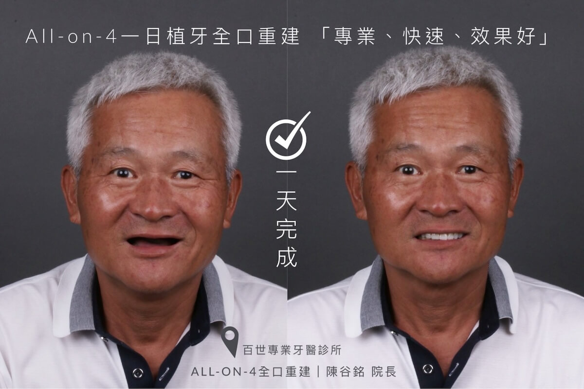 以我們百世專業牙醫診所一位 60 多歲的患者為例,他長期受上顎嚴重缺牙所苦,雖然嘗試配戴了活動假牙,但始終無法適應。因為食物無法正常咀嚼,長期下來甚至引發了消化不良的問題;此外,臉頰也因為缺乏牙齒的支撐而明顯消瘦,讓他在外觀與自信上都受到了不小的影響。